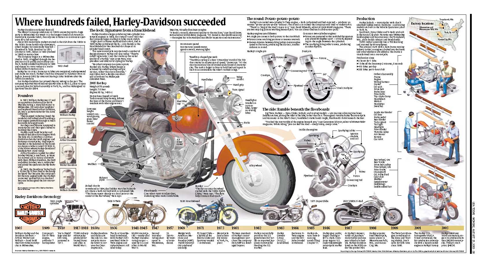 This is a full-page graphic created for a USA TODAY story on Harley-Davidson’s 100th anniversary. It contains information about the company’s history, its most popular motorcycles, how Harley engines make their signature sound, and how a motorcycle is assembled.