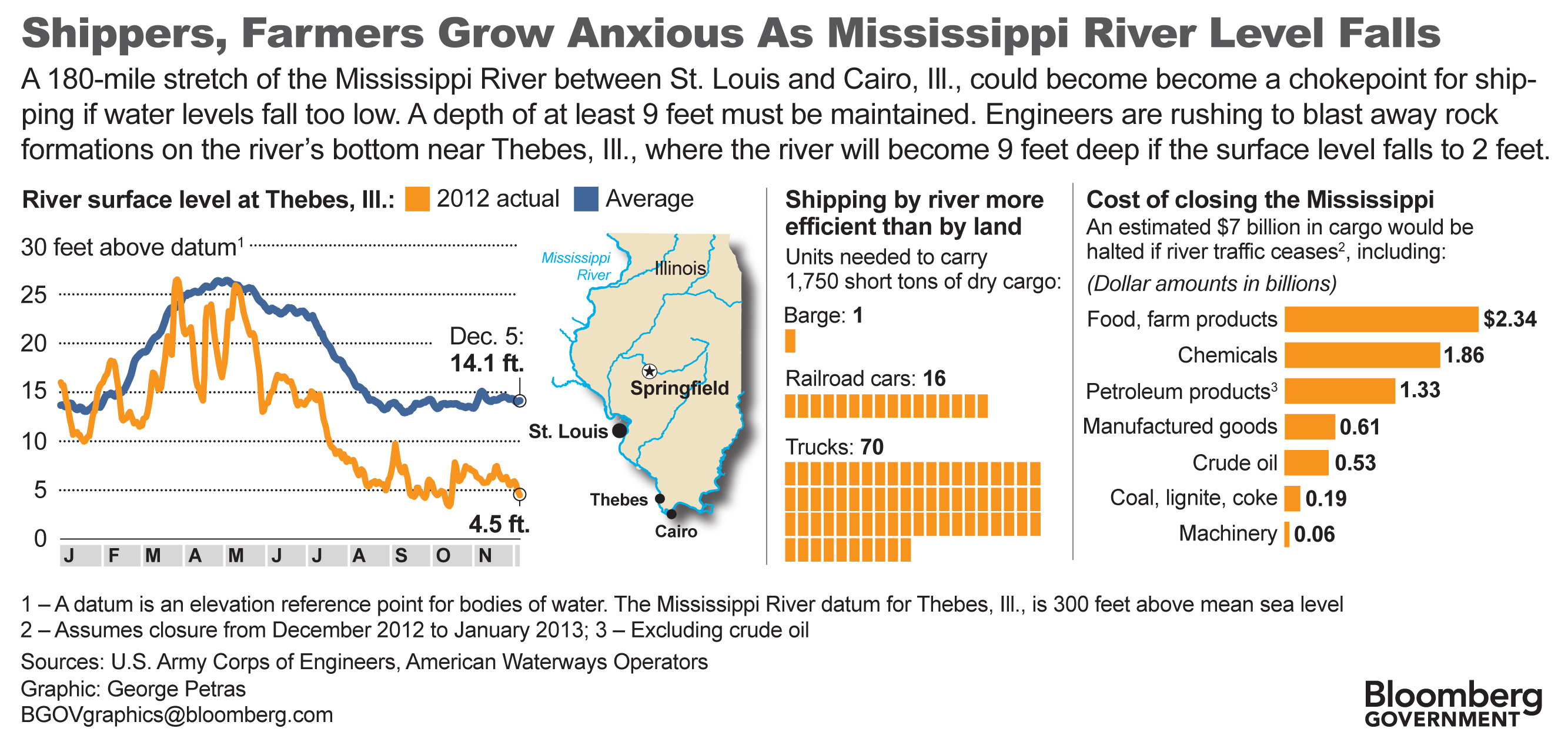 This graphic accompanied a story on the falling level of the Mississippi River and how it affects shipping. A map pinpoints a crucial area of the river and charts show efficiency of river transportation, the cost to various industries of closing the river and changes in river levels. I took pains to explain the term “datum,” since it’s commonly used by the Army Corps of Engineers in river measurements.