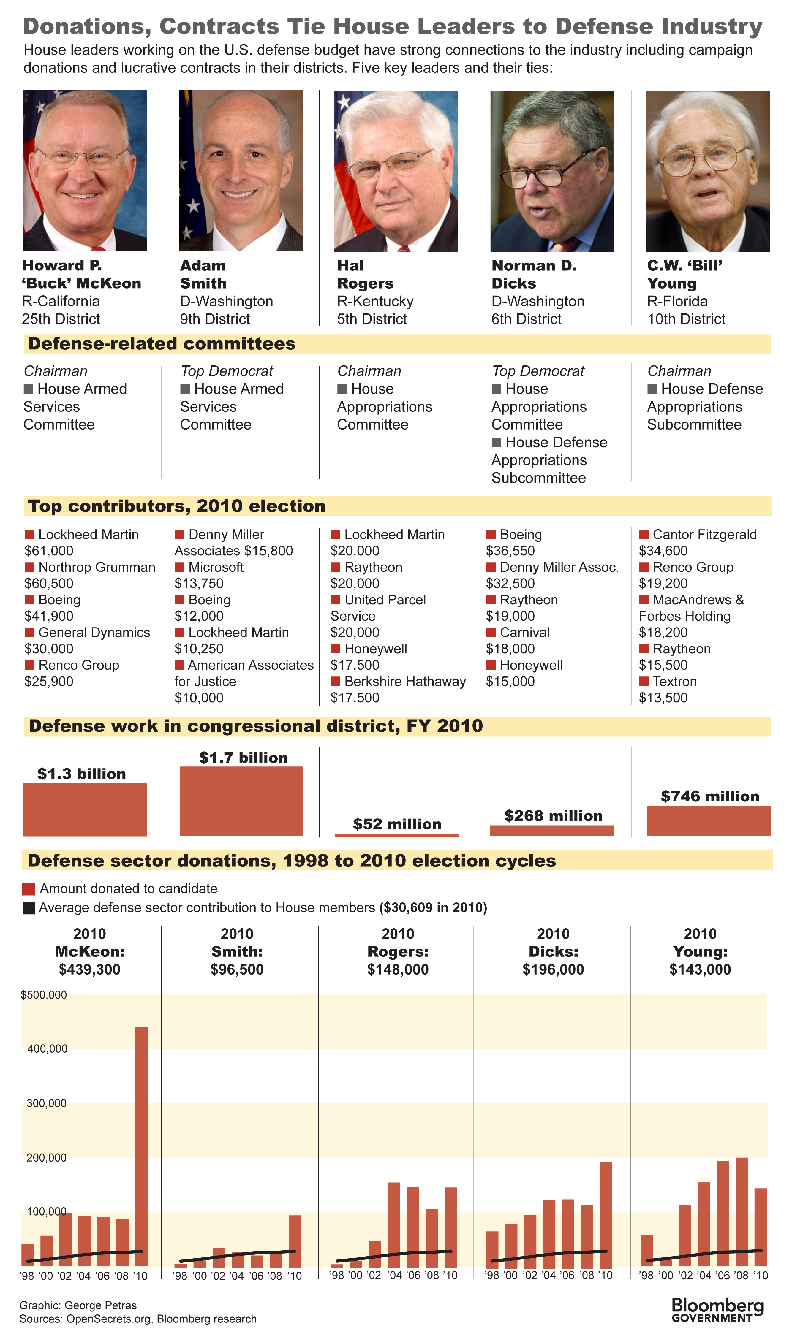 This graphic shows the connections between the U.S. defense industry and influential members of Congress. In many cases, not only do major defense contractors contribute to election campaigns, they also maintain significant manufacturing, research, or other operations in the districts of congressional members.