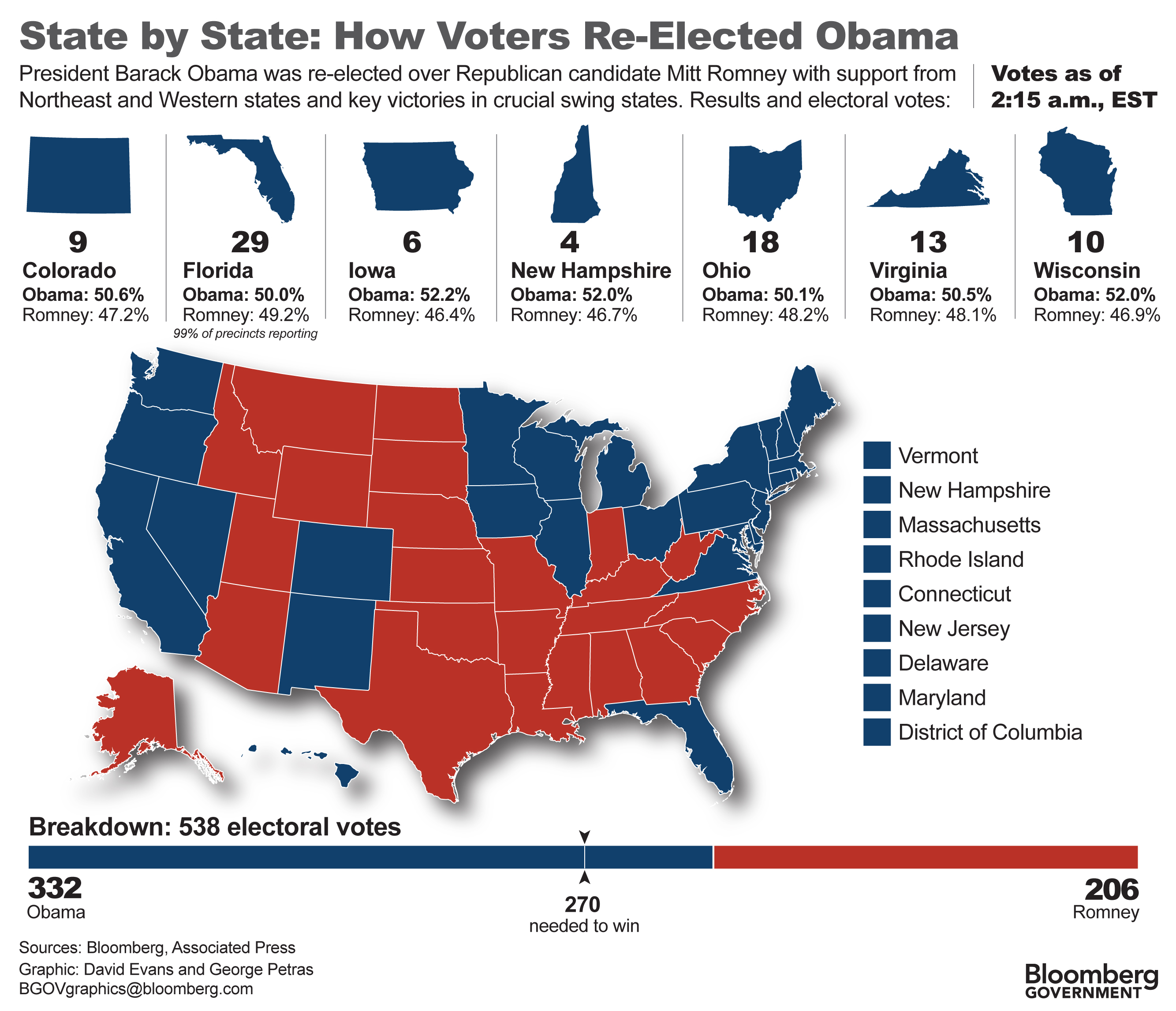 This combination of maps and a bar chart showed which states, especially crucial swing states, supported President Obama on election day. David Evans helped me set up the sliding bar chart, which I constantly updated throughout the evening of the election as results were announced.