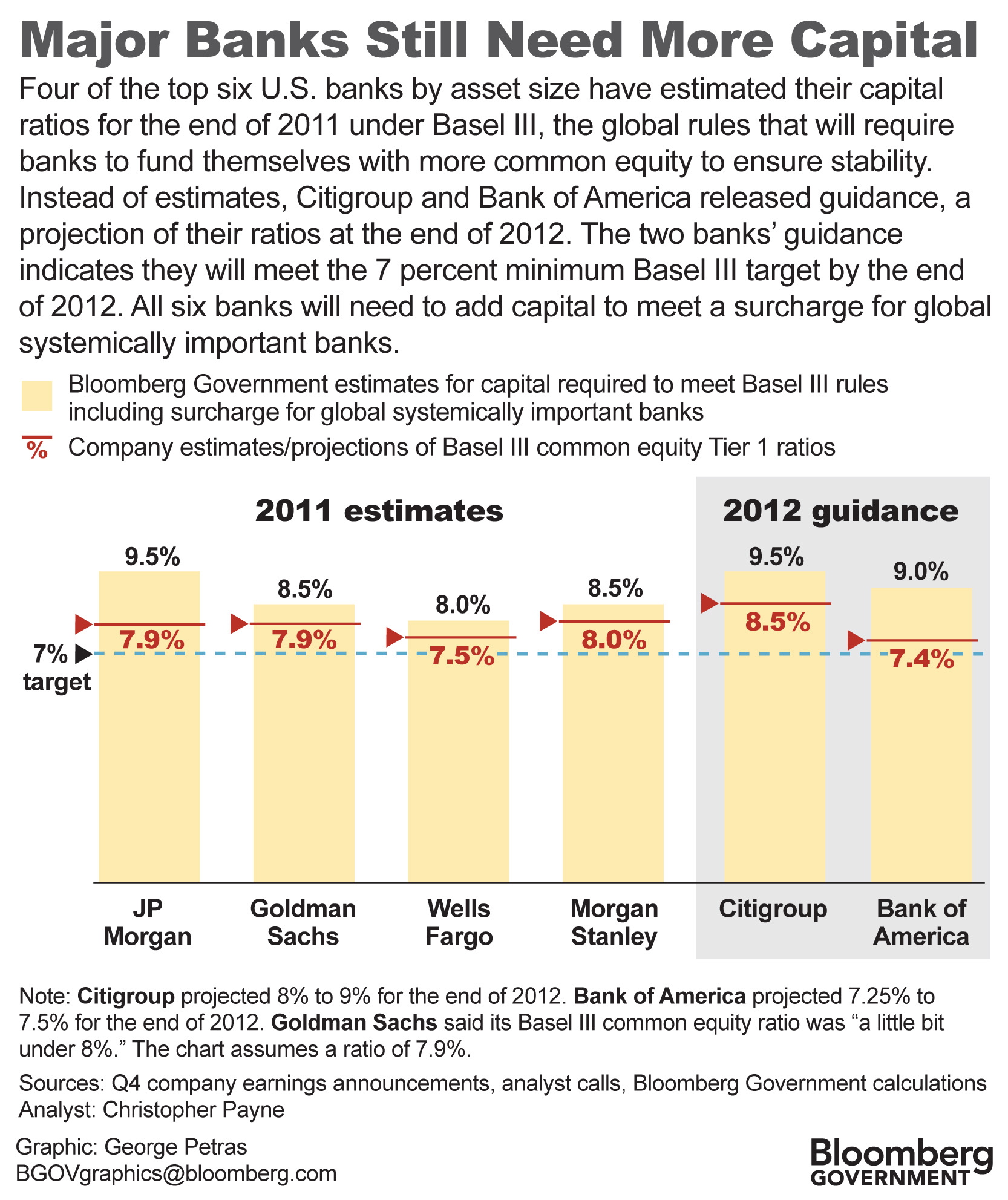 This 2011 graphic shows the estimates of six major U.S. banks for their capital ratios, the ratio of capital to assets, or net worth to everything they own, including liabilities. All six estimate they will exceed the basic Basel III requirement of 7%.